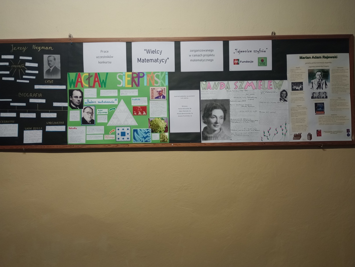 W ramach projektu, odbył się rodzinny konkurs techniczno-plastyczny "Wielcy Matematycy" dla uczniów klas IV-VIII i ich krewnych. Uczestnicy tej rywalizacji wyszukiwali i selekcjonowali informacje dotyczące sylwetki i dokonań wybranego polskiego matematyka, a następnie prezentowali je na plakacie. O ich kreatywności i oryginalności można się przekonać oglądając najwyżej ocenione prace na dwóch tablicach na parterze.