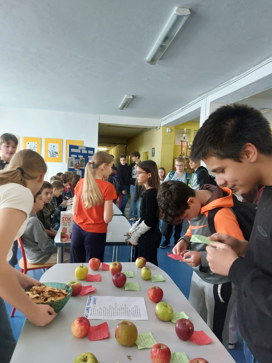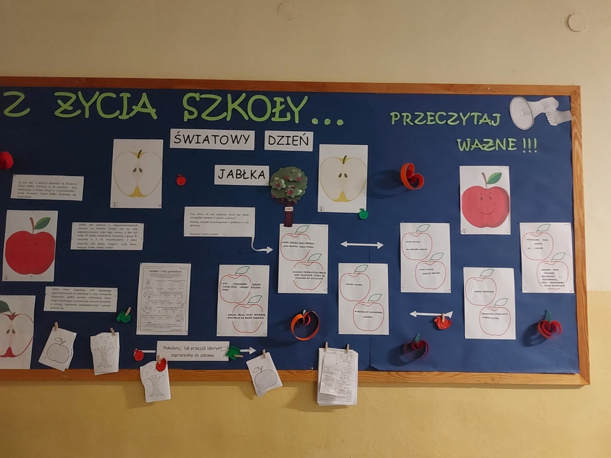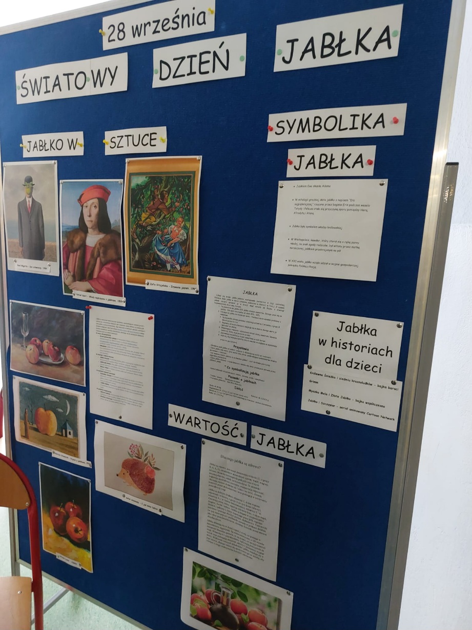 Dnia 29 września w ramach zajęć z edukacji zdrowotnej klasa 6c wraz z wychowawcą zrealizowała projekt z okazji Światowego Dnia Jabłka. Uczniowie przedstawili wartości odżywcze jabłek i ich wpływ na zdrowie człowieka, przygotowali prezentację i degustację rożnych potraw, przetworów i przekąsek jabłkowych. Społeczność szkolna mogła obejrzeć wystawę różnych odmian jabłek. Całość wzbogacono o elementy kultury- zaprezentowano motyw jabłka w sztuce, malarstwie, literaturze dziecięcej oraz piosence.
