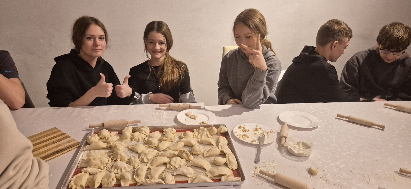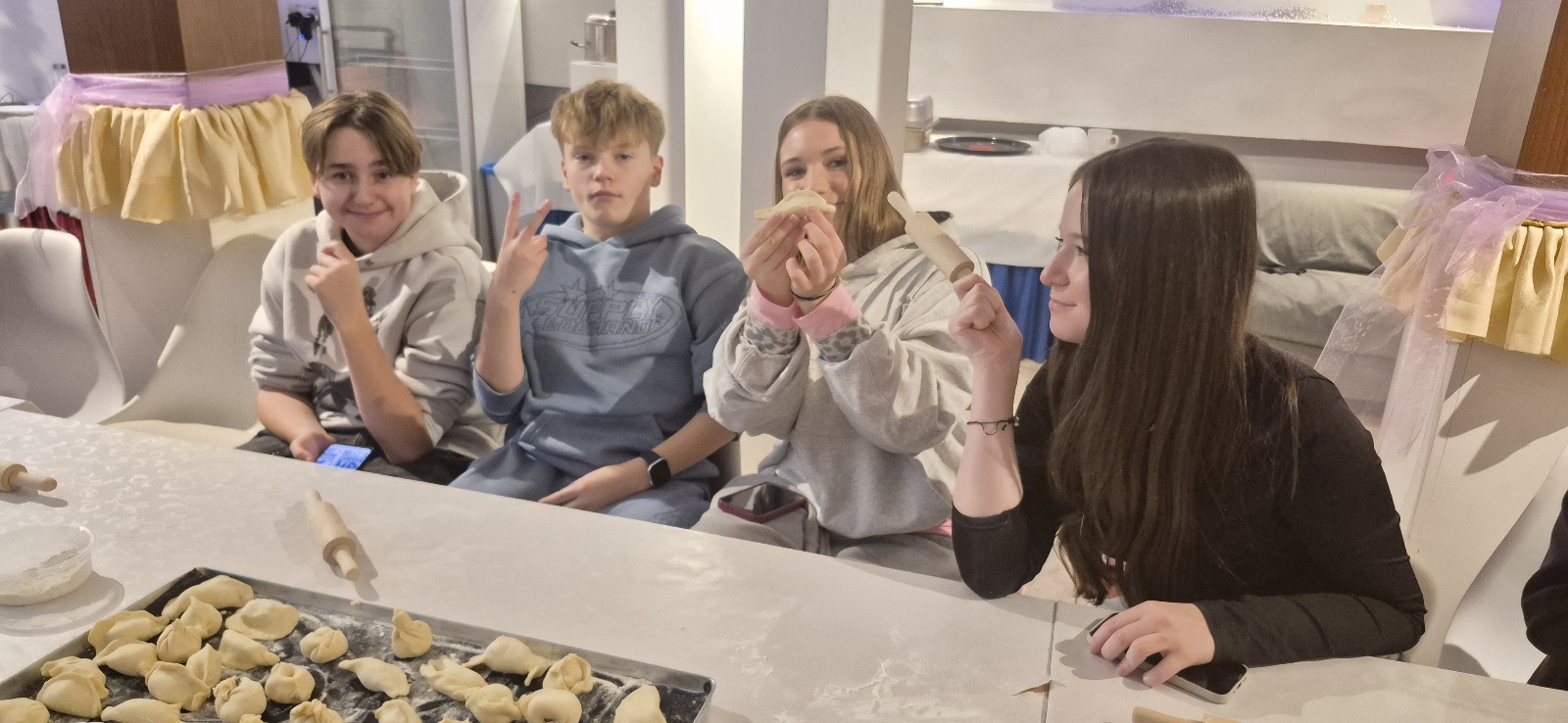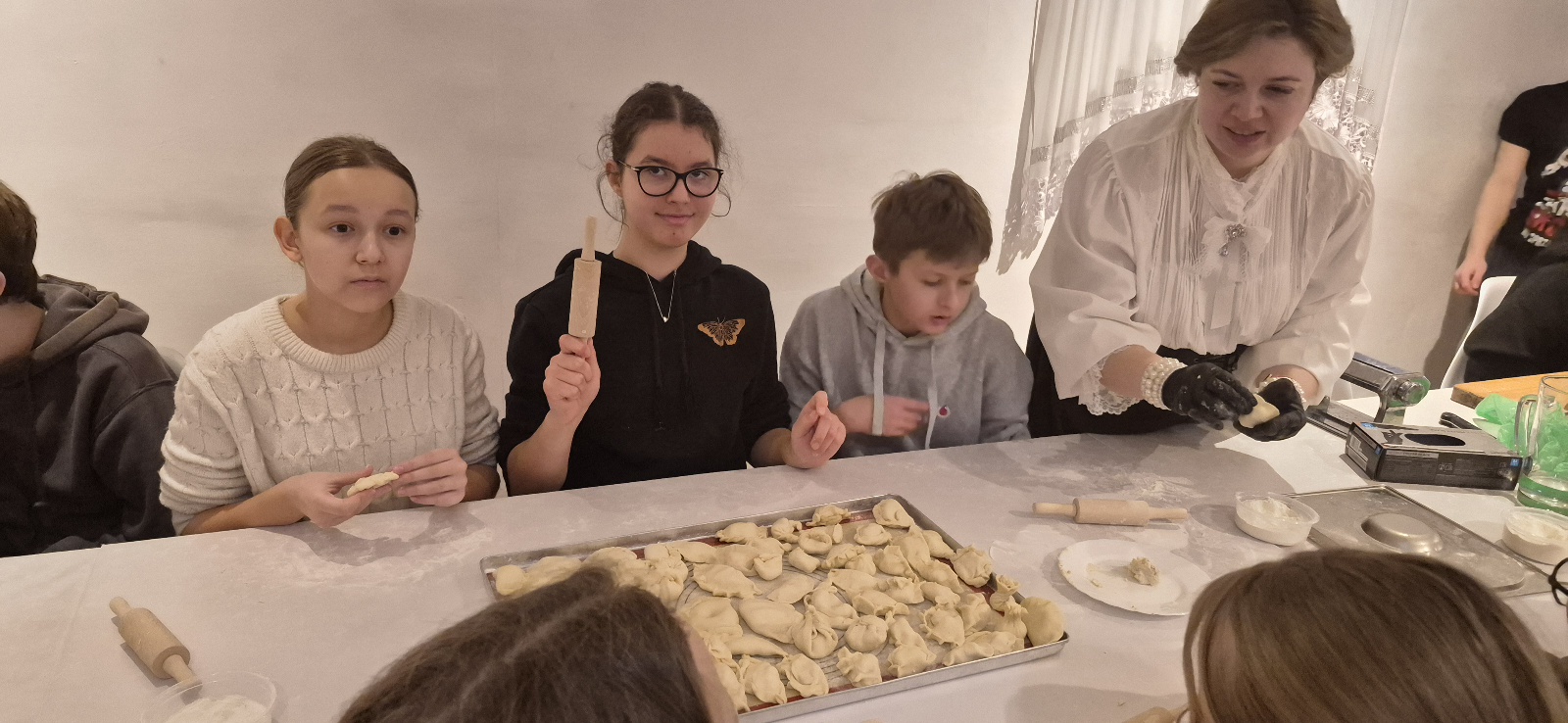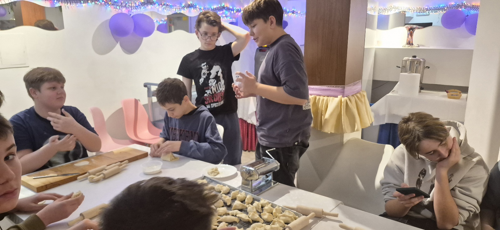 Dnia 19 grudnia klasy 7a i 7c wzięły udział w warsztatach kulinarnych w najstarszej w Łodzi pierogarni Teremok. Po krótkim wprowadzeniu uczniowie poznali etapy przygotowania ciasta i farszu, a następnie samodzielnie lepili pierogi pod opieką prowadzących. Zajęcia przebiegły w miłej i spokojnej atmosferze, sprzyjającej współpracy. Na zakończenie odbyła się degustacja przygotowanych potraw.