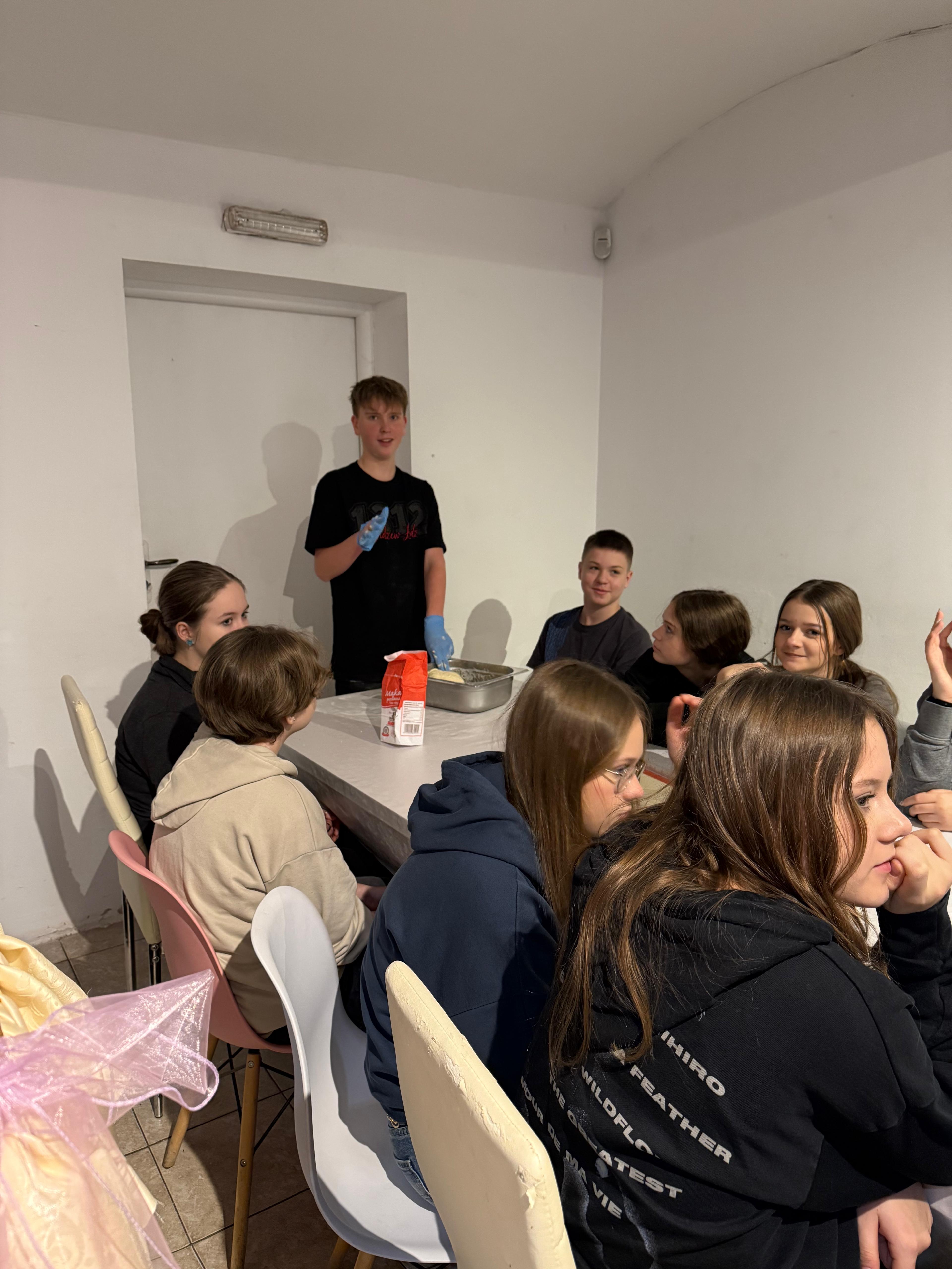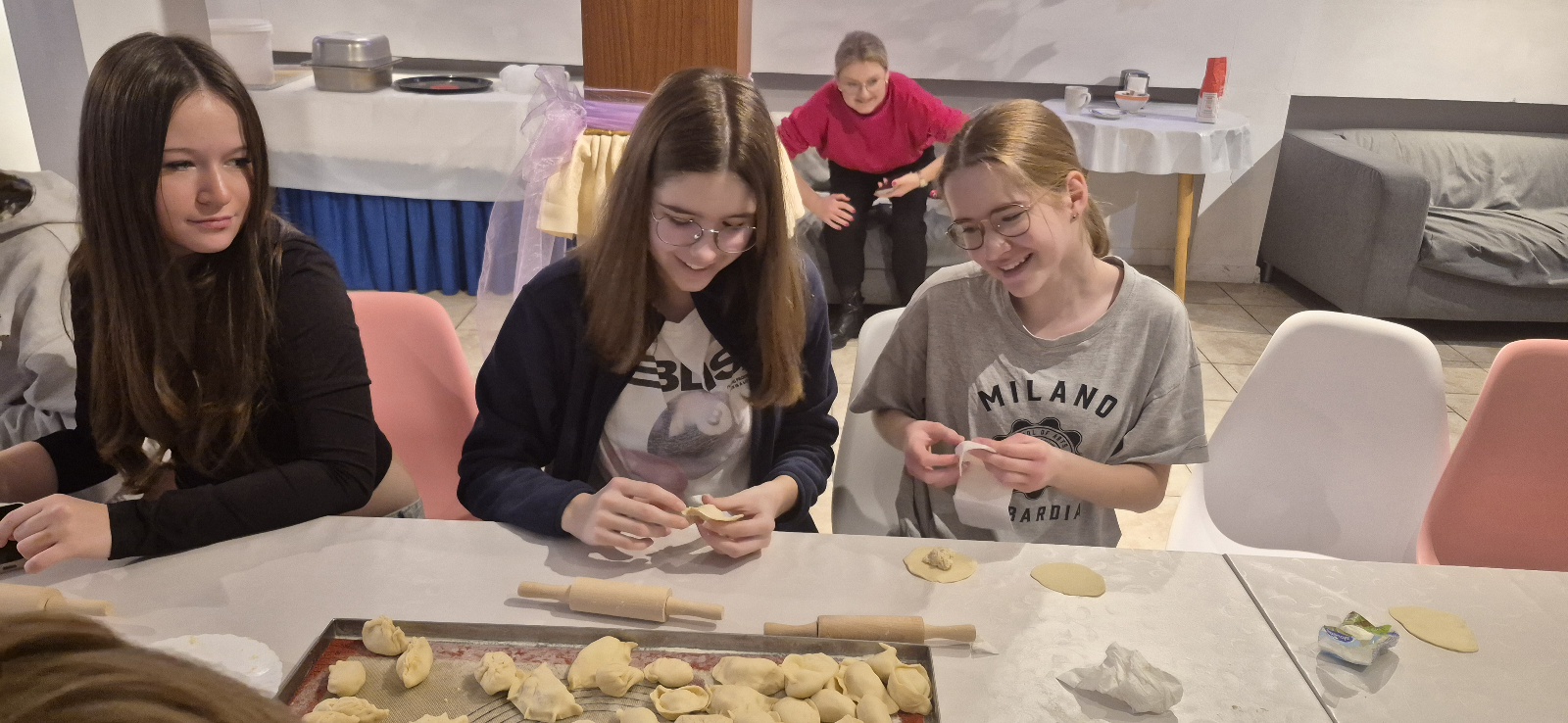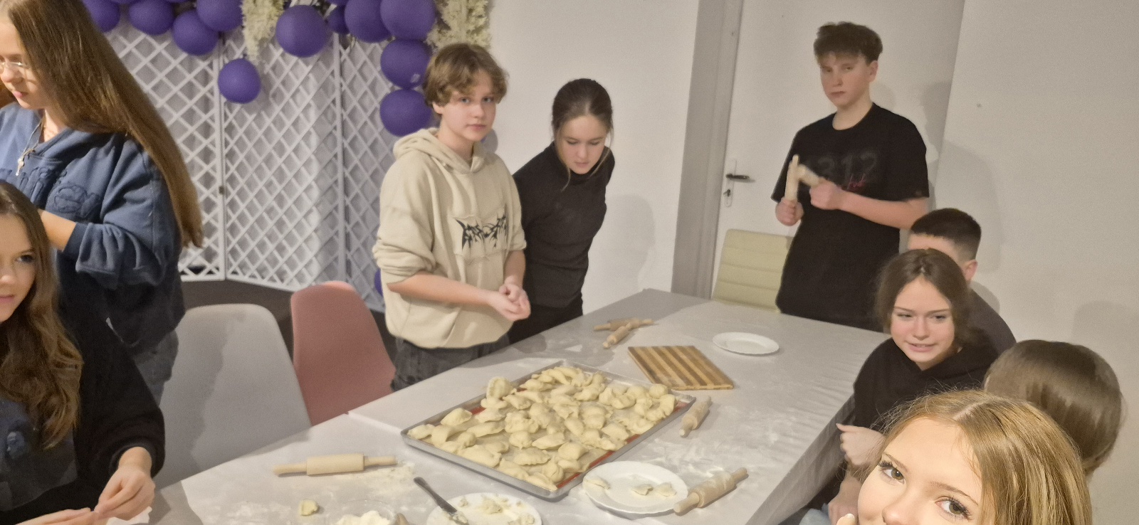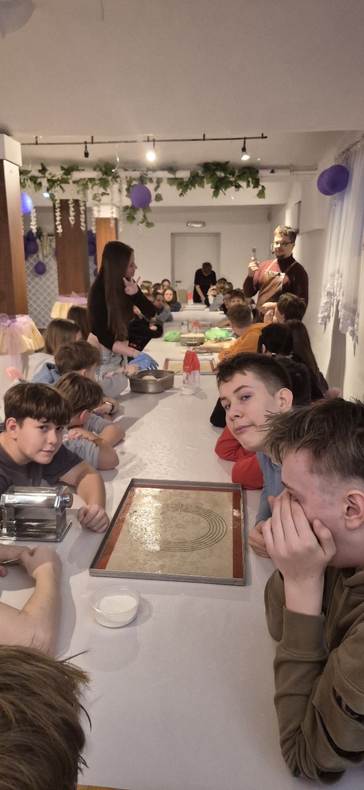 Dnia 19 grudnia klasy 7a i 7c wzięły udział w warsztatach kulinarnych w najstarszej w Łodzi pierogarni Teremok. Po krótkim wprowadzeniu uczniowie poznali etapy przygotowania ciasta i farszu, a następnie samodzielnie lepili pierogi pod opieką prowadzących. Zajęcia przebiegły w miłej i spokojnej atmosferze, sprzyjającej współpracy. Na zakończenie odbyła się degustacja przygotowanych potraw.